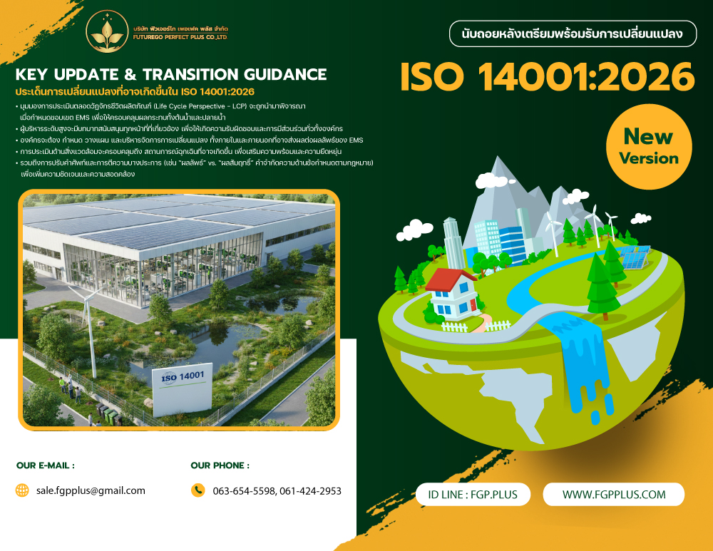 FGP ให้บริการฝึกอบรม ISO หลายหลักสูตร ไม่ว่าจะเป็น ISO/IEC17025, ISO9001, ISO14001, ISO45001, GHPs, HACCP, ISO13485, IATF16949, Core Tools, ISO22000, ISO/IEC27001, ISO/IEC29110 เป็นต้น โดยหลักสูตรการอบรมของเราจะมีทั้งข้อกำหนด, การตรวจติดตามภายใน Internal Audit, การจัดทำระบบเอกสาร DCC, กฎหมายที่เกี่ยวข้องกับระบบ ISO, การปรับปรุงขั้นตอนการทำงาน, การประเมินความเสี่ยง Risk, การประเมินค่าความไม่แน่นอนของการวัด Uncertainty, การประเมินคาร์บอนฟุตพริ้นท์องค์กร (CFO), การประเมินคาร์บอนฟุตพริ้นท์ของผลิตภัณฑ์ (CFP) และหลักสูตรอื่นๆ อีกมากมาย